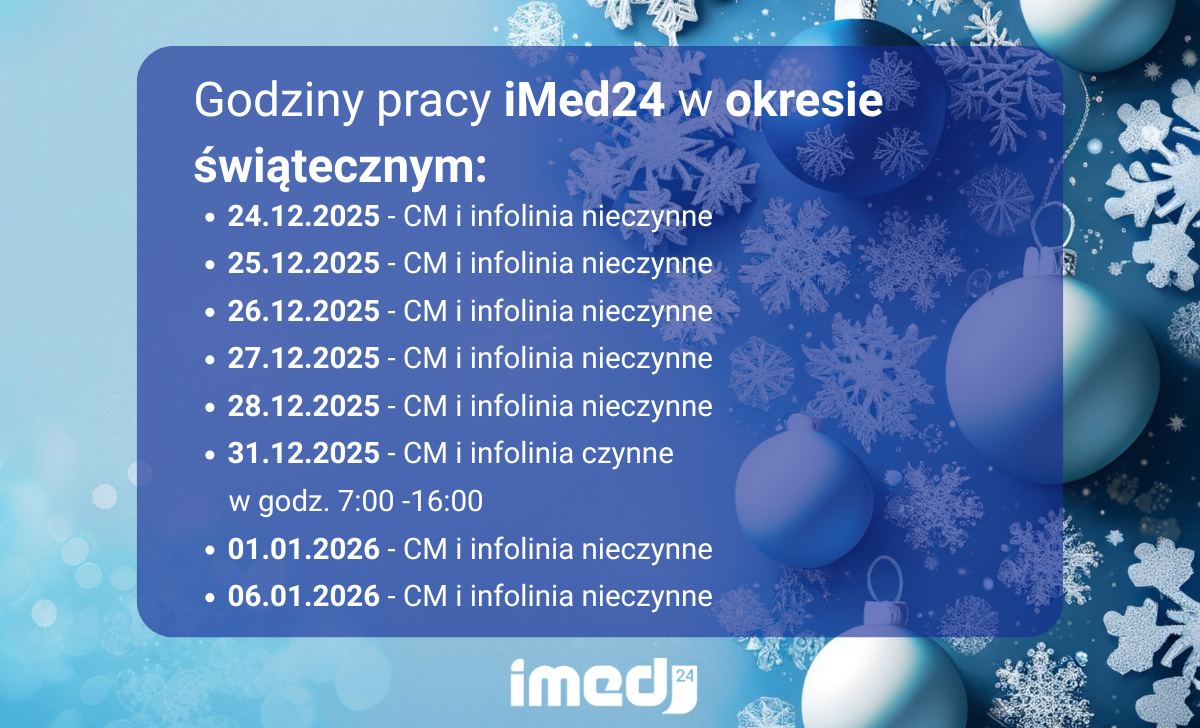 informujemy, że w okresie Świąt Bożego Narodzenia oraz Nowego Roku harmonogram pracy Centrum Medycznego iMed24 oraz infolinii ulega zmianie.